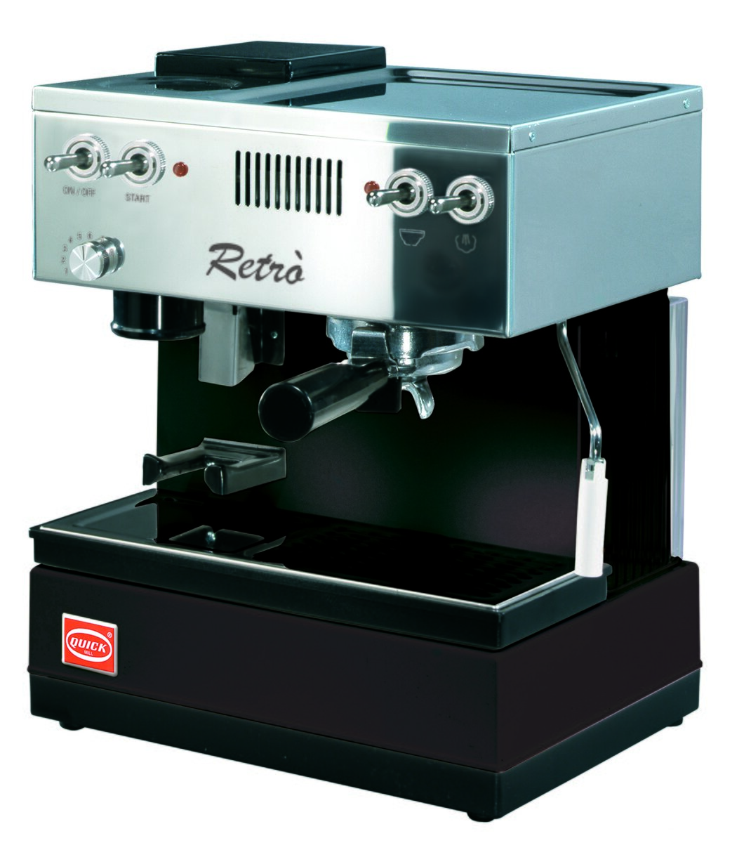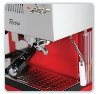kávovar QuickMill RETRO 1 pákový profesionálny kávovar so zabudovaným mlynčekom. Manuálne spustenia a zastavenie kávy, vody i par. Celokovový RETRO štýl kávovaru.