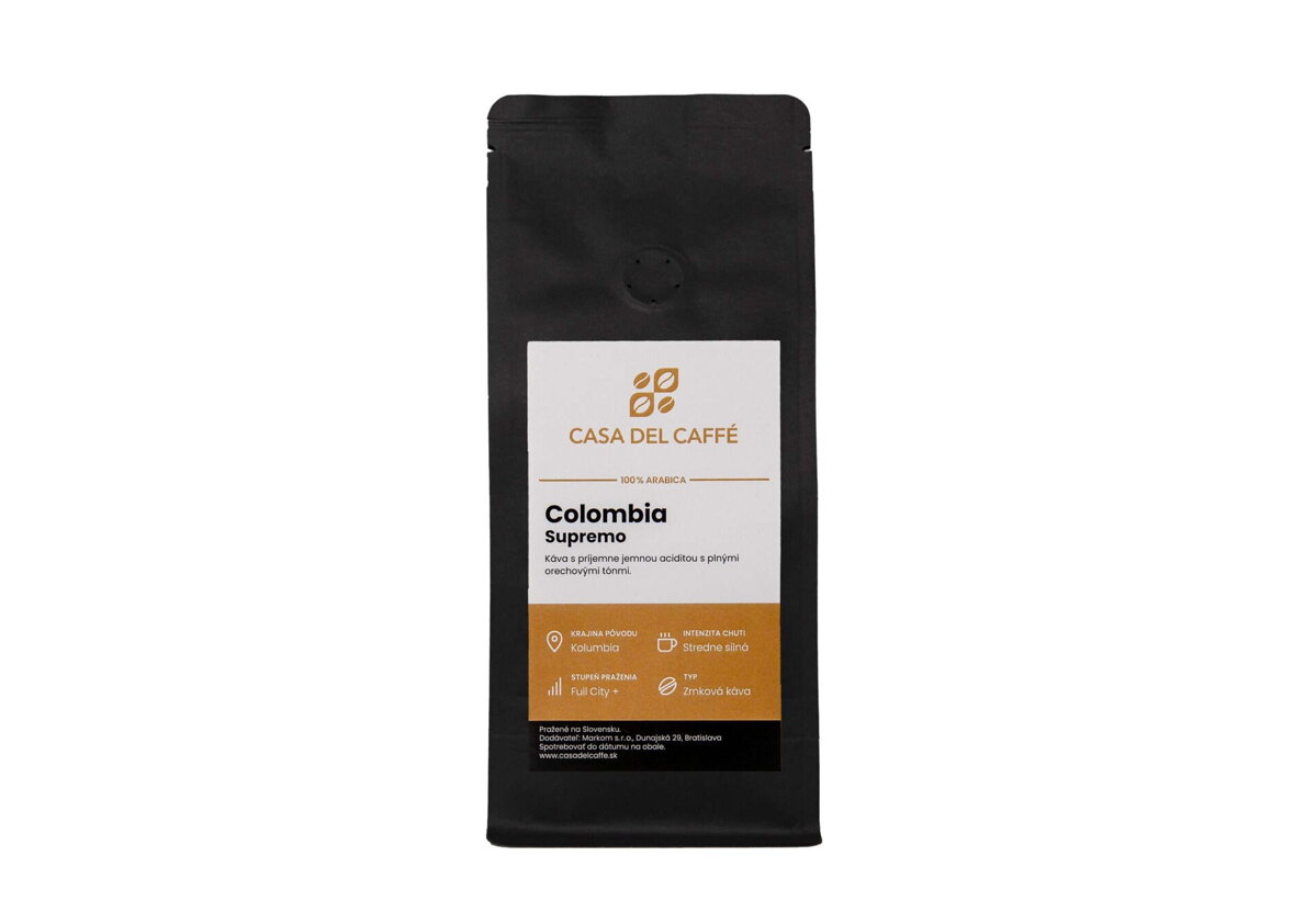 Columbia Supremo 100% Arabica je stredne silná, chuťovo výrazná káva s ovocnou a ľahko orieškovou chuťou. Kolumbia je najväčší výrobca vysokokvalitnej kávy s nezameniteľným puncom kvality, ktorá sa pestuje medzi výbežkami Ánd. Svojou chuťou sa radí medzi gurmánske kávy.